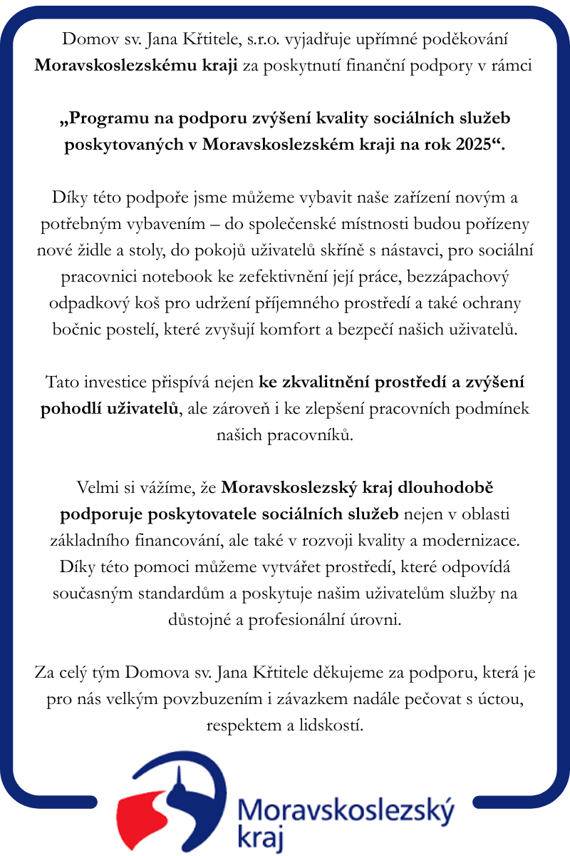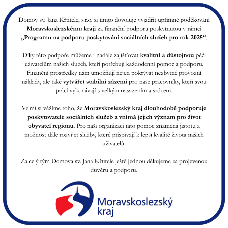 Domov sv. Jana Křtitele, s. r. o. chce tímto vyslovit velké poděkování Moravskoslezskému kraji, který v rámci projektu "Program na podporu zvýšení kvality sociálních služeb poskytovaných v Moravskoslezském kraji na rok 2020 (https://www.msk.cz/cs/temata/dotace/program-na-podporu-zvyseni-kvality-socialnich-sluzeb-poskytovanych-v-moravskoslezskem-kraji-na-rok-2020-4034/), podpořil naše zařízení. Bez jeho pomoci bychom nemohli realizovat náš záměr, kterým je vybudování větší společenské místnosti, která bude lépe vyhovovat potřebám našich uživatelů a vybudovat nový pokoj, díky kterému budeme moci rozšířit naši kapacitu.