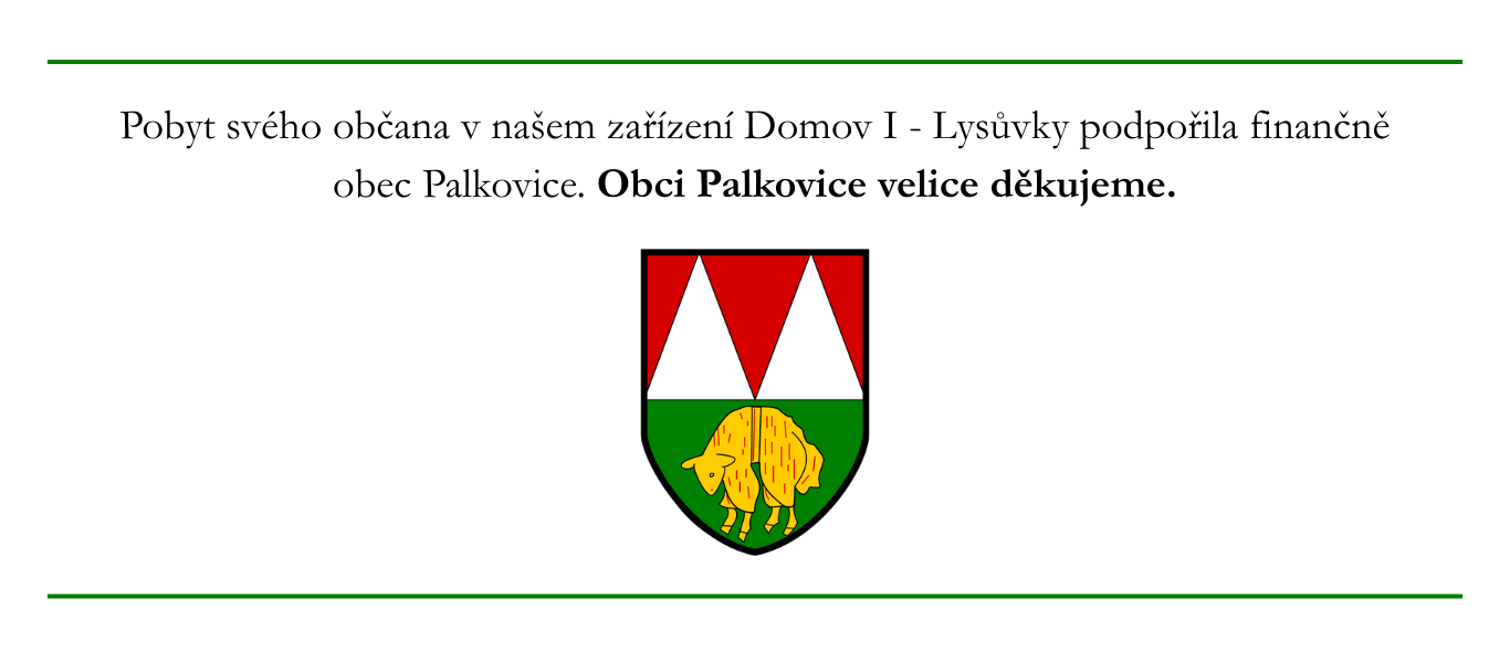 Pobyt své občanky v našem zařízení Domov I - Lysůvky podpořila finančně obec Palkovice. Obci Palkovice velice děkujeme.