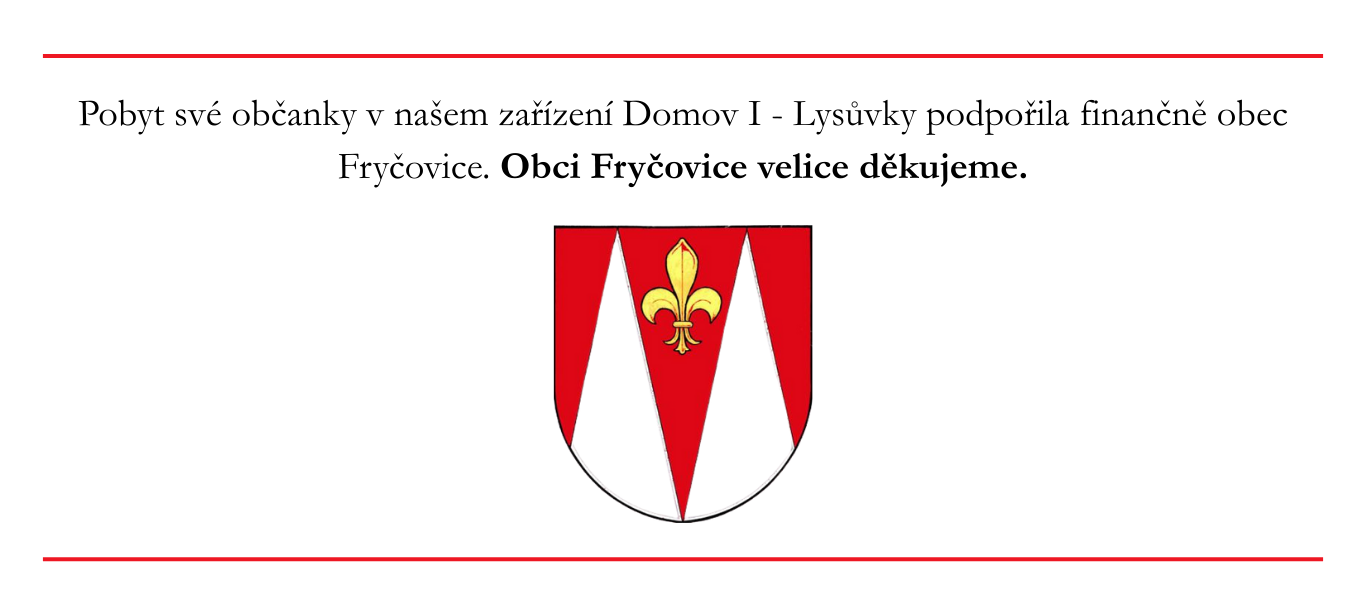 Obec Fryčovice podpořila darem na provozní náklady svých občanů umístěných v zařízení částkou 24.000 Kč.