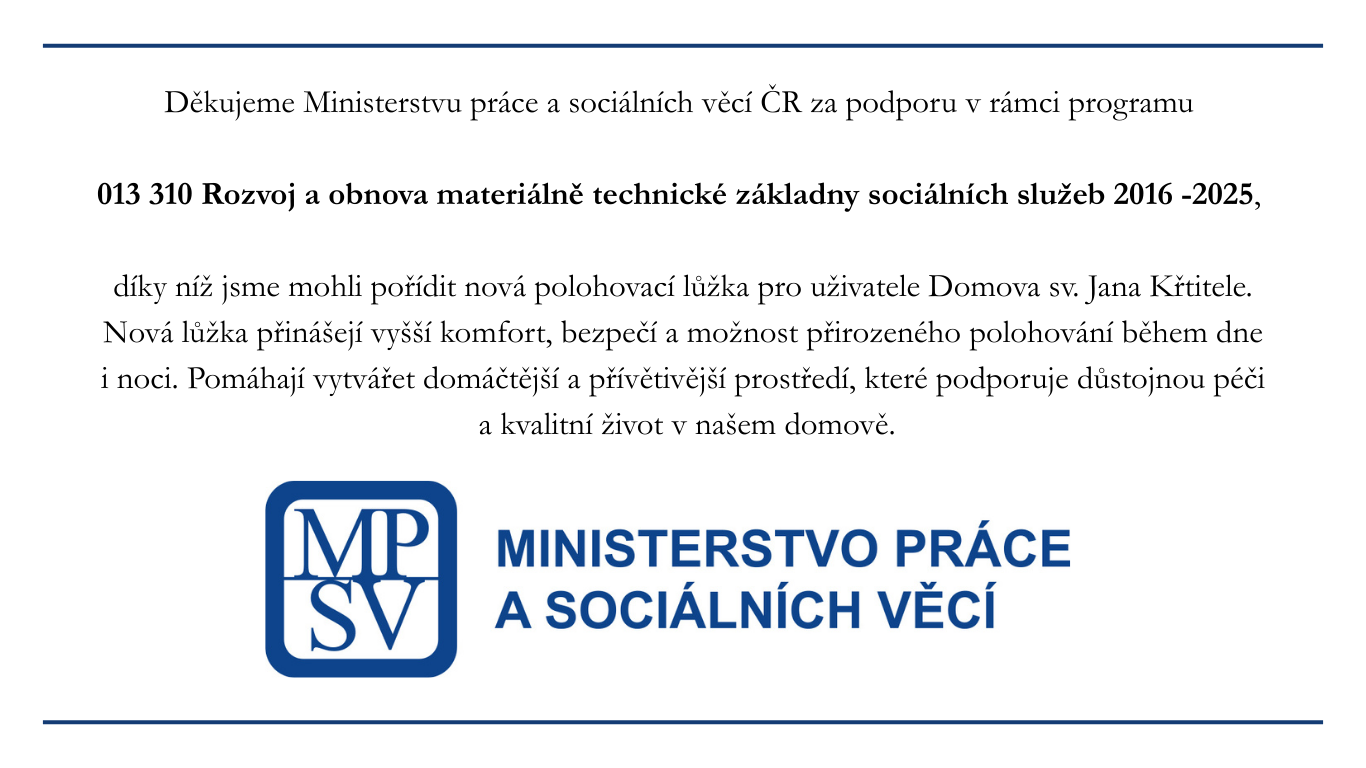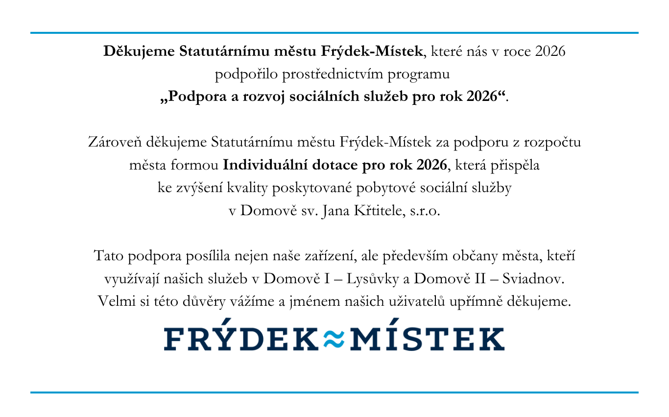 Rovněž děkujeme statutárnímu městu Frýdek-Místek za podporu, kterou nám poskytlo v rámci Individuální neinvestiční dotace " Podpora občanů statutárního města Frýdek-Místek, jímž je posyktována pobytová sociální služba v Domově sv. Jana Křtitele s.r.o."