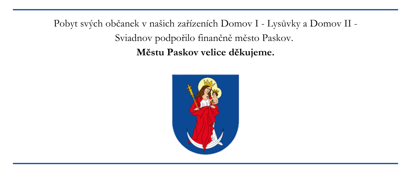 Pobyt své občanky v našem zařízení Domov I - Lysůvky podpořilo finančně město Paskov. Městu Paskov velice děkujeme.