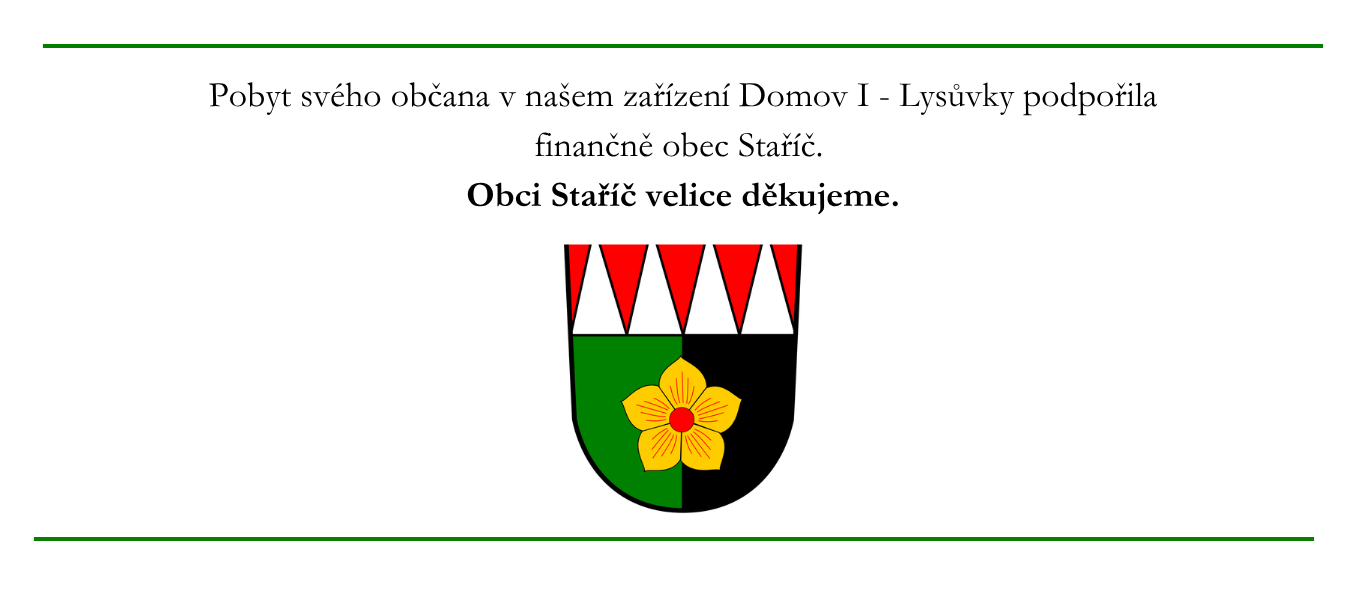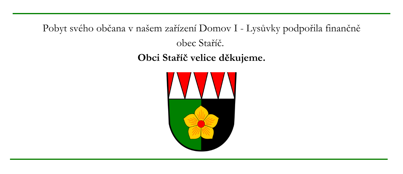 Pobyt svého občana v našem zařízení Domov I - Lysůvky podpořilo finančně obec Staříč. Obci Staříč velice děkujeme.