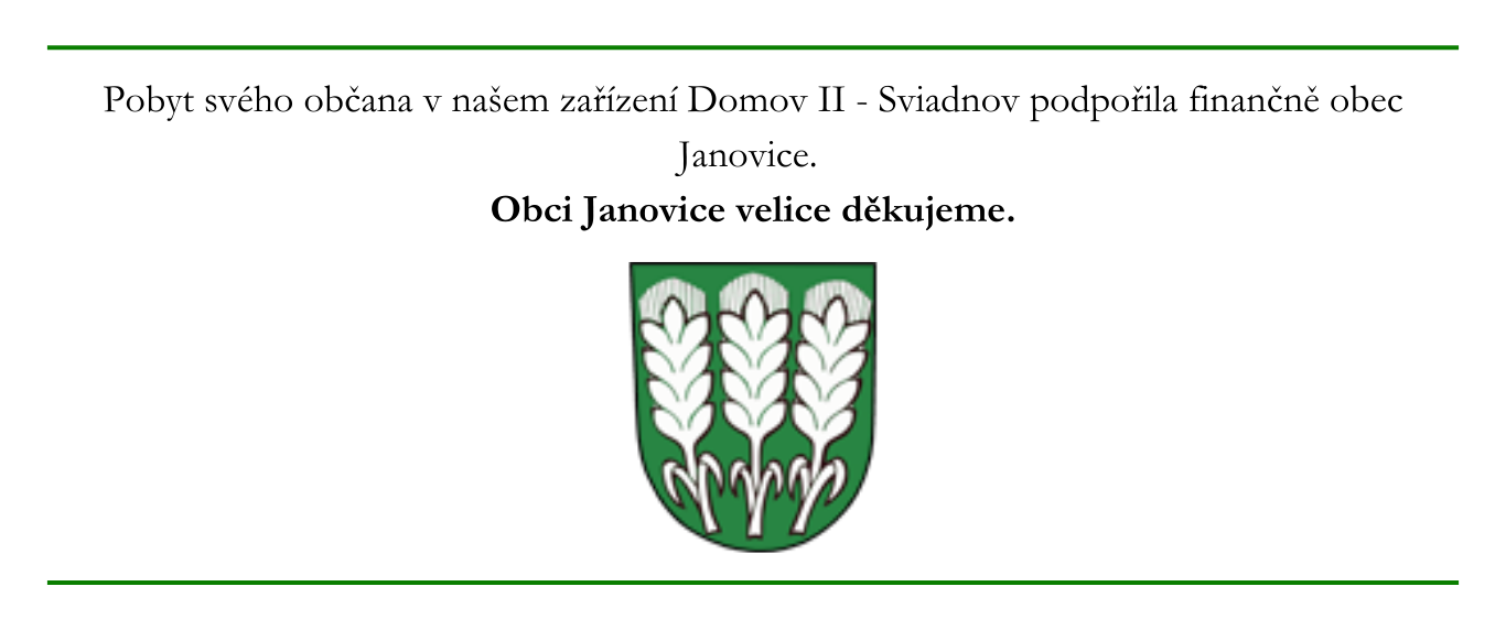 Pobyt svého občana v našem zařízení Domov II - Lysůvky podpořilo finančně obec Janovice. Obci Janovice velice děkujeme.