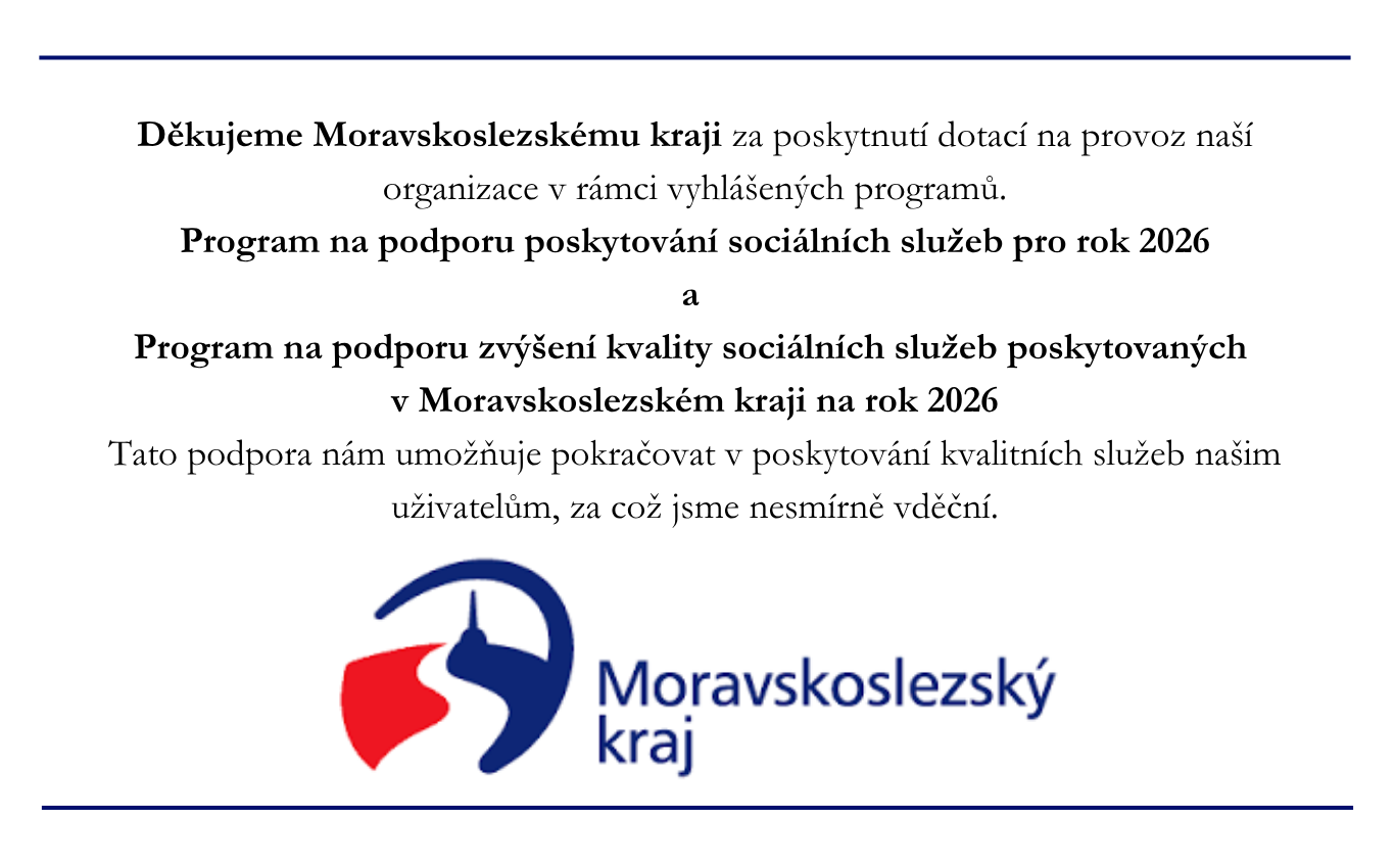 Moravskoslezský kraj podpořil naši organizaci dotací na provoz ve výši 1,150.000 Kč v rámci vyhlášeného dotačního Programu na podporu poskytování sociálních služeb pro r. 2023.